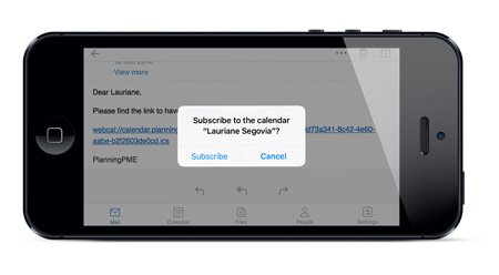 Para visualizar todos los calendarios que haya suscrito en diferentes dispositivos como el iPhone o el IPAD, nada más simple! Cuando una persona quiere compartir contigo su calendario de PlanningPME, se va a enviar un correo electrónico que contiene un enlace. A continuación, sólo tiene que hacer clic en este enlace para añadir este calendario y ya está.